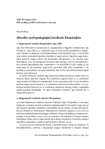 Huszti, Ilona (2022) Aktuális nyelvpedagógiai kérdések Kárpátalján = Актуальні проблеми мовної педагогіки на Закарпатті = Current language pedagogy issues in Transcarpathia. ACTA ACADEMIAE BEREGSASIENSIS, PHILOLOGICA, 1 (2). pp. 219-232. ISSN 27866718