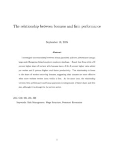 I investigate the relationship between bonus payments and firm performance using a large-scale Hungarian linked employer-employee database. I found that firms with a 10% higher share of workers with bonuses have a 3.9%–4.6% higher value added per worker and 3 percent higher total factor productivity. This relationship is linear in the share of workers receiving bonuses, suggesting that bonuses are more effective when more workers receive them within a firm. At the same time, the relationship between firm performance and bonus payments is independent of labour share and firm size, although it is stronger in the service sector.