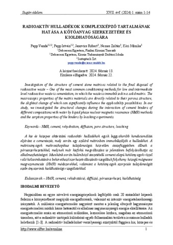 Papp, Vanda and Papp, István and Janovics, Róbert and Nemes, Zoltán and Kéri, Mónika (2024) Radioaktív hulladékok komplexképző tartalmának hatása a kötőanyag szerkezetére és kioldhatóságára. SUGÁRVÉDELEM, 17 (1). pp. 1-14. ISSN 2060-2391