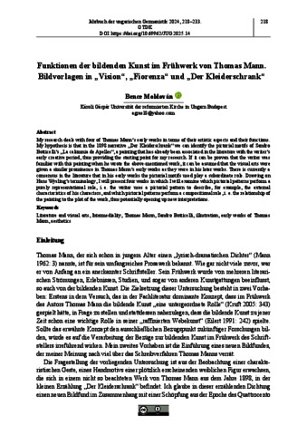 Moldován, Bence (2025) Funktionen der bildenden Kunst im Frühwerk von Thomas Mann : Bildvorlagen in „Vision“, „Fiorenza“ und „Der Kleiderschrank“. JAHRBUCH DER UNGARISCHEN GERMANISTIK, 2024. pp. 218-233. ISSN 1217-0216