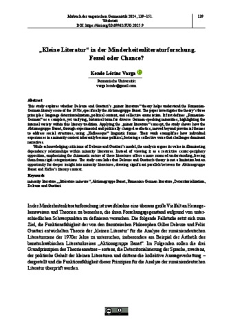 Varga, Kende Lőrinc (2025) „Kleine Literatur“ in der Minderheitenliteraturforschung : Fessel oder Chance? JAHRBUCH DER UNGARISCHEN GERMANISTIK, 2024. pp. 139-151. ISSN 1217-0216