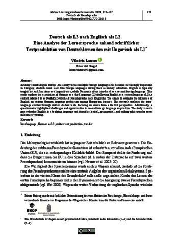 Lantos, Viktória (2025) Deutsch als L3 nach Englisch als L2 : Eine Analyse der Lernersprache anhand schriftlicher Textproduktion von Deutschlernenden mit Ungarisch als L1. JAHRBUCH DER UNGARISCHEN GERMANISTIK, 2024. pp. 121-137. ISSN 1217-0216
