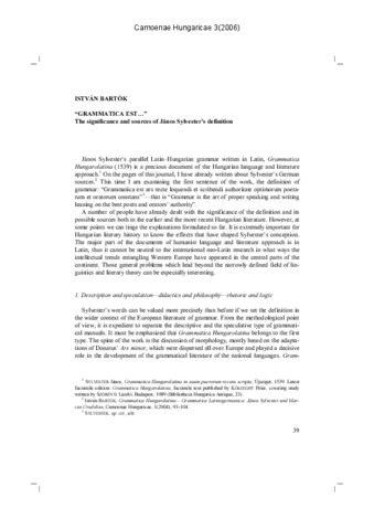Bartók, István (2006) "Grammatica est..." The Significance and Sources of János Sylvester’s Definition. CAMOENAE HUNGARICAE, 3. pp. 39-58. ISSN 1786-5484