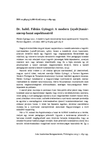 Fábián Gyöngyi 2021. A modern (nyelv)tanárszerep hazai aspektusairól. Veszprém, Pannon Egyetem. 116 oldal. ISBN 978-963-396-185-8