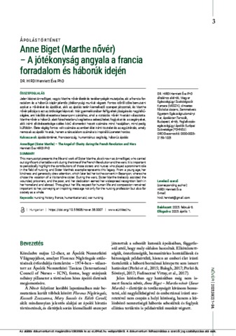 Jelen kézirat Anne Biget, vagyis Marthe nővér életét és tevékenységét mutatja be, aki a francia forradalom és a háborúk idején jelentős jótékonysági munkát végzett. Fontos időről időre bemutatni azokat a nővéreket és ápolókat, akik az ápolás terén kiemelkedő szerepet játszottak, és Marthe nővér példája is ezt az örökséget képviseli. Már gyermekkorában felfigyeltek jóságára és nagylelkűségére, ami később elvezette a besançon-i zárdához, ahol a vizitációs nővéri hivatást választotta. Marthe nővér a háborúk alatt fáradhatatlanul segítette a sebesülteket, foglyokat és a szegényeket, akik iránti elkötelezettsége széles körű elismerést hozott számára mind hazájában, mind pedig külföldön. Élete végéig fontos volt számára az emberi élet iránti tisztelet és az együttérzés, amely nemcsak az ápolói hivatás, hanem a társadalom számára is inspiráló üzenetet hordoz.Jelen kézirat Anne Biget, vagyis Marthe nővér életét és tevékenységét mutatja be, aki a francia forradalom és a háborúk idején jelentős jótékonysági munkát végzett. Fontos időről időre bemutatni azokat a nővéreket és ápolókat, akik az ápolás terén kiemelkedő szerepet játszottak, és Marthe nővér példája is ezt az örökséget képviseli. | This manuscript presents the life and work of Sister Marthe, also known as Anne Biget, who carried out significant charitable work during the time of the French Revolution and the wars. It is important to periodically highlight the contributions of those sisters and nurses who played a prominent role in the field of nursing, and Sister Marthe’s example represents this legacy. From a young age, her kindness and generosity drew attention, which later led her to the convent in Besançon, where she chose the vocation of a Visitandine sister. During the wars, Sister Marthe tirelessly assisted the wounded, prisoners, and the poor, and her dedication earned her widespread recognition both in her homeland and abroad. Throughout her life, respect for human life and compassion remained important to her, conveying an inspiring message not only for the nursing profession but also for society as a whole.