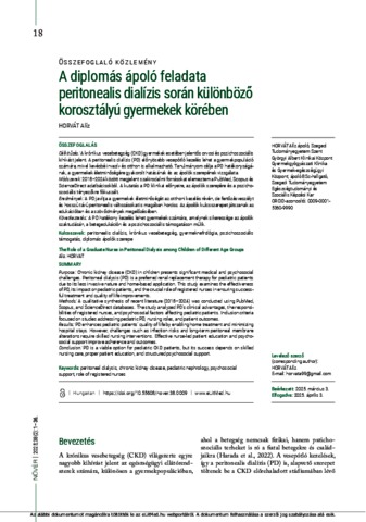 Bevezetés A krónikus vesebetegség (CKD) gyermekek esetében jelentős orvosi és pszichoszociális kihívást jelent. A peritonealis dialízis (PD) előnyösebb vesepótló kezelés lehet a gyermekpopuláció számára, mivel kevésbé invazív és otthon is alkalmazható. Tanulmányom célja a PD hatékonyságának, a gyermekek életminőségére gyakorolt hatásának és az ápolók szerepének vizsgálata.Módszerek2018–2024 között megjelent szakirodalmi forrásokat elemeztem a PubMed, Scopus és ScienceDirect adatbázisokból. A kutatás a PD klinikai előnyeire, az ápolók szerepére és a pszichoszociális tényezőkre fókuszált.EredményekA PD javítja a gyermekek életminőségét az otthoni kezelés révén, de fertőzésveszélyt és hosszú távú peritonealis változásokat is magában hordoz. Az ápolók kulcsszerepet játszanak az edukációban és a szövődmények megelőzésében.KövetkeztetésA PD hatékony kezelés lehet gyermekek számára, amelynek sikeressége az ápolók szaktudásán, a betegedukáción és a pszichoszociális támogatáson múlik.A krónikus vesebetegség (CKD) gyermekek esetében jelentős orvosi és pszichoszociális kihívást jelent. A peritonealis dialízis (PD) előnyösebb vesepótló kezelés lehet a gyermekpopuláció számára, mivel kevésbé invazív és otthon is alkalmazható. | Purpose: Chronic kidney disease (CKD) in children presents significant medical and psychosocial challenges. Peritoneal dialysis (PD) is a preferred renal replacement therapy for pediatric patients due to its less invasive nature and home-based application. This study examines the effectiveness of PD, its impact on pediatric patients, and the crucial role of registered nurses in ensuring successful treatment and quality of life improvements. Methods: A qualitative synthesis of recent literature (2018–2024) was conducted using PubMed, Scopus, and ScienceDirect databases. The study analyzed PD’s clinical advantages, the responsibilities of registered nurses, and psychosocial factors affecting pediatric patients. Inclusion criteria focused on studies addressing pediatric PD, nursing roles, and patient outcomes. Results: PD enhances pediatric patients’ quality of life by enabling home treatment and minimizing hospital stays. However, challenges such as infection risks and long-term peritoneal membrane alterations require skilled nursing interventions. Effective nurse-led patient education and psychosocial support improve adherence and outcomes. Conclusion: PD is a viable option for pediatric CKD patients, but its success depends on skilled nursing care, proper patient education, and structured psychosocial support.