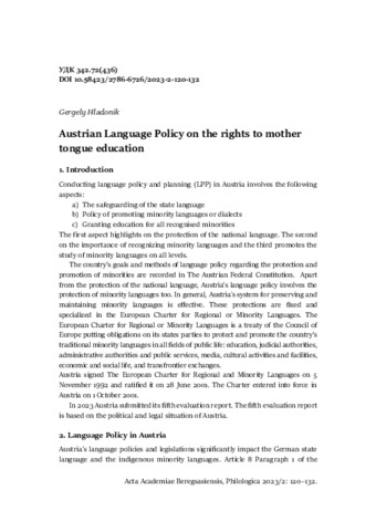 Hladonik, Gergely (2023) Austrian Language Policy on the rights to mother tongue education = Az osztrák nyelvpolitika az anyanyelvi oktatáshoz fűződő jogok tekintetében. ACTA ACADEMIAE BEREGSASIENSIS, PHILOLOGICA, 2 (2). pp. 120-132. ISSN 27866718