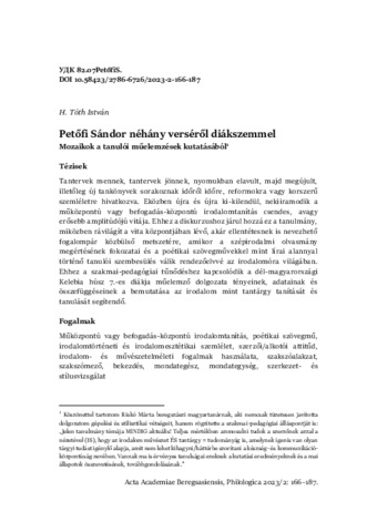 H. Tóth, István (2023) Petőfi Sándor néhány verséről diákszemmel : Mozaikok a tanulói műelemzések kutatásából= Some of Sándor Petőfi's poems from a student's point of view Mosaics from the research of students' analyses of art. ACTA ACADEMIAE BEREGSASIENSIS, PHILOLOGICA, 2 (2). pp. 166-187. ISSN 27866718