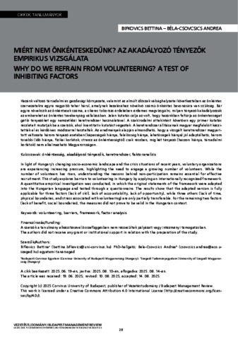 Bifkovics, Bettina and Béla-Csovcsics, Andrea (2025) Miért nem önkénteskedünk? Az akadályozó tényezők empirikus vizsgálata = Why do we refrain from volunteering? A test of inhibiting factors. VEZETÉSTUDOMÁNY, 56 (11). pp. 28-40. ISSN 0133-0179
