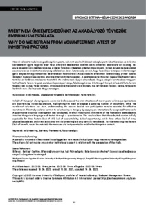 Hazánk változó társadalmi és gazdasági környezete, valamint az elmúlt időszak válsághelyzetei következtében az önkéntes szervezetekre egyre nagyobb teher hárul, amelynek kezeléséhez növekvő számú önkéntes bevonására van szükség. Bár egyre növekszik az önkéntesek száma, a sikeres toborzás érdekében érdemes megvizsgálni, milyen tényezők akadályozzák az embereket az önkéntes tevékenység vállalásában. Jelen kutatás célja az volt, hogy hazánkban feltárja az önkéntességet gátló tényezőket egy nemzetközi keretrendszer használatával. A szakirodalmi áttekintést követően egy primer kutatás részleteit mutatják be a szerzők, ahol kvantitatív kutatást végeztek. A keretrendszer állításainak magyar megfelelőit készítették el és kérdőíves módszerrel tesztelték. Az eredmények alapján elmondható, hogy a vizsgált keretrendszer magyarított változata három tényező esetében (képességek hiánya, felelősség hiánya, lehetőségek hiánya) jól adaptálható, három további (idő hiánya, fizikai korlátok, stressz az önkéntességtől) csak részben, míg két tényező (haszon hiánya, társadalmi korlátok) nem alkalmazható Magyarországon. | In light of Hungary’s changing socio-economic landscape and the crisis situations of recent years, voluntary organizations are experiencing increasing pressure, highlighting the need to engage a growing number of volunteers. While the number of volunteers has risen, understanding the reasons behind non-participation remains essential for effective recruitment. This study explores barriers to volunteering in Hungary by applying an internationally recognized framework. A quantitative empirical investigation was conducted, in which the original statements of the framework were adapted into the Hungarian language and tested through a questionnaire. The results show that the adapted version is fully applicable for three factors (lack of skill, lack of accountability, lack of opportunity), while three others (lack of time, physical boundaries, and stress associated with volunteering) are only partially transferable. For the remaining two factors (lack of benefit, social boundaries), the measures did not prove to be valid in the Hungarian context.