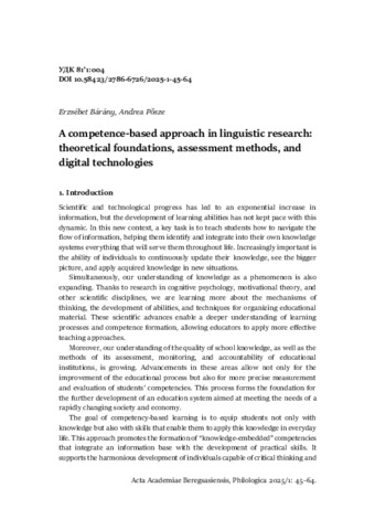 Bárány, Erzsébet and Pősze, Andrea (2025) A competence-based approach in linguistic research: theoretical foundations, assessment methods, and digital technologies = Компетентнісний підхід у мовознавчих дослідженнях: теоретичні засади, методи вимірювання та роль цифрових технологій = Kompetenciaalapú megközelítés a nyelvészeti kutatásokban: elméleti alapok, mérési módszerek és digitális technológiák. ACTA ACADEMIAE BEREGSASIENSIS, PHILOLOGICA, 4 (1). pp. 45-64. ISSN 27866718