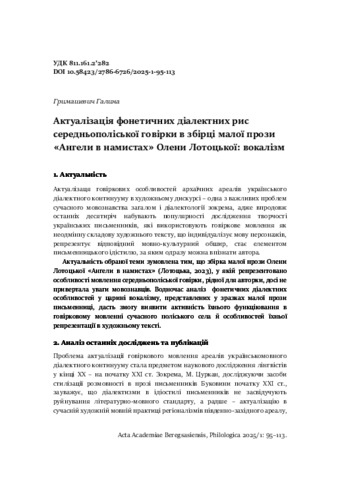 Hrymashevych, Halyna (2025) Актуалізація фонетичних діалектних рис середньополіської говірки в збірці малої прози «Ангели в намистах» Олени Лотоцької: вокалізм = Actualization of phonetic dialectal features of the Central Polissian dialect in the short prose collection Angels in Necklaces by Olena Lototska: vocalism = A közép-polisszjai nyelvjárás fonetikai sajátosságainak aktualizálása Olena Lototska „Ангели в намистах” című kisprózagyűjteményében: vokalizmus. ACTA ACADEMIAE BEREGSASIENSIS, PHILOLOGICA, 4 (1). pp. 95-113. ISSN 27866718