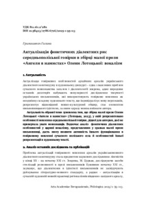 Статтю присвячено проблемі актуалізації фонетичних діалектних рис у царині вокалізму середньополіської говірки в збірці малої прози Олени Лотоцької «Ангели в намистах». Зауважено, що письменниця в художніх текстах, насамперед у мовленні персонажів, продемонструвала всі основні особливості середньополіської системи голосних, із-поміж яких – рефлексація *ě як [е] в ненаголошеній позиції та як [и] – у наголошеній, хоча спорадично відзначено й [і], що свідчить про динамічні зміни в діалектах; послідовність функціювання монофтонга [у] на місці етимологічного *о здебільшого в наголошених новозакритих складах, натомість у відкритих збережено [о]; наявність на місці давнього *е в новозакритому наголошеному складі майже послідовно монофтонга [у] з пом’якшенням попереднього приголосного; збереження давнього *і як [і], що має здатність пом’якшувати попередній приголосний; реалізація *ę як монофтонга [е], перед яким [л] зберігає історичну м’якість. Мета наукової праці – схарактеризувати фонетичні особливості середньополіської говірки в царині вокалізму, актуалізовані в новій збірці зразків малої прози Олени Лотоцької «Ангели в намистах». У студії проаналізовано фонетичні риси в системі голосних, виокремлені методом суцільного відбору із зазначеної збірки; виявлено регулярність функціювання середньополіських фонетичних особливостей системи вокалізму в мовленні персонажів. Наукова новизна дослідження полягає в тому, що збірка прозових мініатюр Олени Лотоцької «Ангели в намистах» досі не була об’єктом системного лінгвістичного дослідження з огляду на функціювання в ній фонетичних діалектних особливостей середньополіської системи вокалізму. Подальшого розвитку набуло питання важливості актуалізації говіркового мовлення, насамперед архаїчних діалектних ареалів, у художньому дискурсі сучасних письменників. У перспективі передбачено дослідження морфологічних особливостей середнополіської говірки, актуалізованих у збірці Олени Лотоцької «Ангели в намистах», а також вивчення вербально представленого в ній світогляду поліщуків. | The article addresses the issue of the actualization of phonetic dialectal features in the field of vocalism characteristic of the Central Polissian dialect, as found in Olena Lototska’s short prose collection Ангели в намистах [Angels in Necklaces]. It is noted that the author, especially through the speech of her characters, demonstrates all the main features of the Central Polissian vowel system. Among these are the occurrences of *ě as [е] in unstressed positions and as [и] in stressed ones, with sporadic occurrences of [i], indicating dynamic changes in the dialects; the consistent use of the monophthong [у] in place of the etymological *o, mostly in stressed newly closed syllables, while [o] is preserved in open syllables; the presence of the monophthong [у] with softening of the preceding consonant in place of the old *e in newly closed stressed syllables; the preservation of the old *i as [i], which tends to soften the preceding consonant; and the realization of *ę as the monophthong [e], with the consonant [л] before it retaining its historical palatalization. The aim of the study is to characterize the phonetic features of the Central Polissian dialect in the field of vocalism as actualized in Olena Lototska’s recent collection of short prose Angels in Necklaces. The study analyses the phonetic features of the vowel system identified through continuous sampling from the collection. It reveals the regularity of the functioning of Central Polissian phonetic traits in the speech of the characters. The scientific novelty of the research lies in the fact that Lototska’s collection of prose miniatures Angels in Necklaces has not previously been the subject of a systematic linguistic study with regard to the phonetic dialectal features of the Central Polissian vocalism system. The study also further develops the discussion of the importance of actualizing dialectal speech, especially that of archaic dialectal areas, in the literary discourse of contemporary authors. Future research is expected to focus on the morphological features of the Central Polissian dialect as actualized in Lototska’s collection Angels in Necklaces, as well as on 