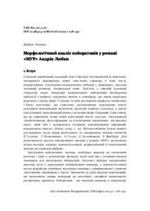 У статті здійснено детальний морфологічний аналіз пейоративної лексики, що використовується в романі «МУР» («Малий український роман») сучасного українського письменника Андрія Любки. Пейоративи, як емоційно забарвлені мовні одиниці, відіграють важливу роль у створенні саркастичного, іронічного або негативного забарвлення тексту. У дослідженні розглядається їхня функція в художньому дискурсі, що дозволяє підкреслити специфіку персонажів, їхні емоційні стани та соціокультурний контекст. Аналіз охоплює 340 лексичних одиниць, з яких 303 класифіковані як пейоративи, а 37 – як інвективи. Пейоративи розподілено на п’ять основних морфологічних категорій: іменники, дієслова, прикметники та прислівники та дієприкметники. Найбільшу кількість становлять іменники та дієслова, що використовуються для характеристики персонажів та опису дій. Наприклад, іменники («фіфа», «гуцулик», «хахаль») підкреслюють соціальну або ґендерну приналежність персонажів. Тоді як дієслова («нализатися», «видудлити», «потикатися») створюють динаміку комічних або іронічних ситуацій. Також наголошено, що у тексті роману є низка іменникових словосполучень на позначення персонажів твору чи опису й характеристики людей, персонажів та ситуацій. Дієслова й дієслівні словосполучення пейоративної лексики позначають процеси споживання, мовлення, переміщення у просторі, мислення, емоційного стану людини та негативно-оціночного значення певних дій, зокрема, інтимного характеру та фізіології людини. За частотою вживання найпоширенішими є дієслова й дієслівні словосполучення на позначення процесу споживання, процесу мовлення, процесу переміщення у просторі. Опрацьовано 113 дієслів й дієслівних словосполучень. Прикметники, прислівники та дієприкметники у романі позначають характеристику людини крізь призму тваринних ознак, зовнішнього вигляду людини та принизливо-оціночних норм поведінки. Дослідження підкреслює значення контексту для визначення функції пейоративів у тексті. Контекстуальний метод дозволяє врахувати залежність між словесними одиницями та їхнім емоційним забарвленням. Використання пейоративної та інвективної лексики додає тексту експресії, реалізму й сатиричного колориту. Окрему увагу приділено класифікації за морфологічними ознаками, що розширює уявлення про функціональність пейоративів у літературі. Актуальність дослідження визначається зростаючим інтересом до емоційно забарвленої лексики та її ролі у художньому дискурсі. Практична цінність роботи полягає у можливості використання результатів у лінгвістичних і літературознавчих дослідженнях, викладанні мовознавства. | The article provides a detailed morphological analysis of pejorative vocabulary used in the novel MUR (“A Small Ukrainian Novel”) by contemporary Ukrainian writer Andriy Lyubka. Pejoratives, as emotionally charged linguistic units, play an important role in creating a sarcastic, ironic, or negatively toned text. The study examines their function in artistic discourse, which helps to underscore the specificity of the characters, their emotional states, and the sociocultural context. The analysis covers 340 lexical units, of which 303 are classified as pejoratives and 37 as invectives. Pejoratives are divided into five main morphological categories: nouns, verbs, adjectives, adverbs, and participles. The largest portion consists of nouns and verbs, which are used to characterize characters and describe actions. For instance, nouns “fifa”, “hutsul”, and “khakhal” (e.g., фіфа, гуцулик, хахаль) emphasize the social or gender affiliation of the characters, while verbs like “nalysiatysia” (to get drunk), “vydudlyty” (to drink up), and “potykatysia” (to poke around) (e.g., нализатися, видудлити, потикатися) create the dynamics