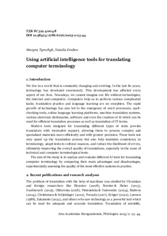 Tymchyk, Maryna and Drabov, Natalia (2025) Using artificial intelligence tools for translating computer terminology = Використання інструментів штучного інтелекту для перекладу комп’ютерної термінології = Mesterséges intelligencia alapú eszközök alkalmazása a számítástechnikai terminológia fordításában. ACTA ACADEMIAE BEREGSASIENSIS, PHILOLOGICA, 4 (2). pp. 23-44. ISSN 27866718