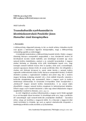 Mádi, Gabriella (2025) Transzkulturális nyelvhasználat és identitáskonstrukció Penckófer János Hamuther című kisregényében = Транскультурне мововживання і конструювання ідентичності в повісті Яноша Пенцкофера «Hamuther» = Transcultural language use and identity construction in János Penckófer’s novella “Hamuther”. ACTA ACADEMIAE BEREGSASIENSIS, PHILOLOGICA, 4 (2). pp. 102-120. ISSN 27866718