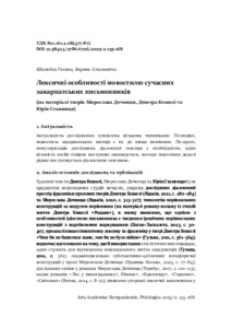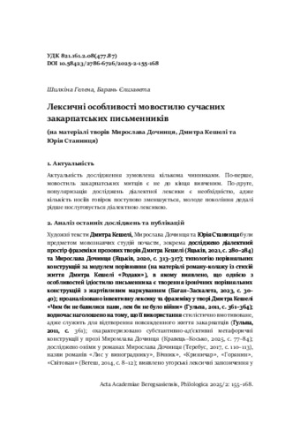 Статтю присвячено аналізу лексичних особливостей мовостилю сучасних закарпатських письменників Мирослава Дочинця, Дмитра Кешелі та Юрія Станинця. Зазначено, що художні тексти цих авторів були предметом мовознавчих студій лише частково. Для кращого розуміння мовостилю письменників представлено основні віхи їхнього життєвого шляху, вказано на місце митців у культурному житті Закарпаття, визначено їхню роль у сучасному українському літературному дискурсі. Наголошено на тому, що художні твори Мирослава Дочинця, Дмитра Кешелі та Юрія Станинця ілюструють культурні цінності закарпатського регіону. Досліджено особливості мовостилю Мирослава Дочинця, Юрія Станинця та Дмитра Кешелі. Виявлено групи слів, що належать до архаїзмів, історизмів і територіальних діалектів у творах «Бранець Чорного лісу», «Розрада-гора» та «Світован» Мирослава Дочинця, «Сусіди» Юрія Станинця та «Політ співочого каміння» Дмитра Кешелі. Констатовано, що мовостиль Мирослава Дочинця, Юрія Станинця та Дмитра Кешелі своєрідний. Письменники використовують закарпатські діалектизми, деколи вузьколокальні, щоб якнайточніше відтворити мововживання мешканців того середовища, яке вони описують. Найчастіше їх уживають у мові персонажів. Статистичні дані свідчать про те, що аналізовані твори містять чимало говіркових лексичних елементів. Застарілу лексику автори вживають з метою відтворення особливостей епохи, про яку ідеться у творі. В аналізованих творах немає пояснень значень незрозумілих слів, зокрема авторських новотворів, вузьколокальних діалектизмів, слів, які вийшли з ужитку тощо. З огляду на це вважаємо, що результати дослідження можуть стати основою для створення словників мови письменників, що полегшить розуміння закарпатської художньої літератури і допоможе популяризувати твори закарпатських письменників серед ширшого кола читачів. | The present article examines the lexical features characteristic of the linguistic style of contemporary Transcarpathian writers Myroslav Dochynets, Dmytro Keshelya, and Yuriy Stanynets. It is noted that the literary texts of these authors have received only limited scholarly attention from a linguistic perspective. To provide a deeper understanding of their individual styles, the article outlines key biographical milestones of each writer, highlights their contributions to the cultural landscape of Transcarpathia, and assesses their roles within modern Ukrainian literary discourse. Particular emphasis is placed on how their literary works reflect the cultural values and traditions of the Transcarpathian region. A detailed analysis of the language used by Dochynets, Keshelya, and Stanynets reveals a consistent use of lexical items from specific categories – namely, archaisms, historicisms, and regional dialectisms. These features are explored through the works “Бранець Чорного лісу”[The Prisoner of the Black Forest], “Розрада-гора”[The Mountain of Consolation], and “Світован” [Svitovan] by Myroslav Dochynets; “Сусіди” [Neighbours] by Yuriy Stanynets; and “Політ співочого каміння” [Flight of the Singing Stones] by Dmytro Keshelya. The study highlights the authors’ use of Transcarpathian dialect forms, including hyperlocal variants, as a means of authentically representing the speech and cultural environment of their characters. These lexical features are most frequently encountered in dialogue. Quantitative data reveal a significant presence of dialectal vocabulary across the analysed texts. In addition, the authors employ outdated and obsolete lexical items to reconstruct the linguistic reality of past historical periods. Notably, the texts do not typically provide glosses or explanations for obscure words – whether authorial neologisms, rare dialectisms, or archaic terms – thus preserving the authenticity of the regional linguistic landscape. The findings of the study may serve as a foundation for compiling lexicographic resources focused on the language of these writers. Such resources would enhance the accessibility of Transcarpathian literature and support the broader dissemination of the region’s literary heritage. | A tanulmány a kortárs kárpátaljai írók – Miroszlav Docsineс, Dmitro Keselja és Jurij Sztaninec – nyelvi stílusának lexikai sajátosságait elemzi. Rámutat arra, hogy e szerzők szépirodalmi műveit a nyelvészeti kutatások csak rész