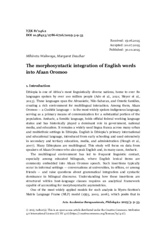 Wakwoya, Mihiretu and Deuchar, Margaret (2025) The morphosyntactic integration of English words into Afaan Oromoo = Az angol szavak morfoszintaktikai integrációja az afaan oromó nyelvbe. ACTA ACADEMIAE BEREGSASIENSIS, PHILOLOGICA, 4 (3). pp. 9-33. ISSN 27866718