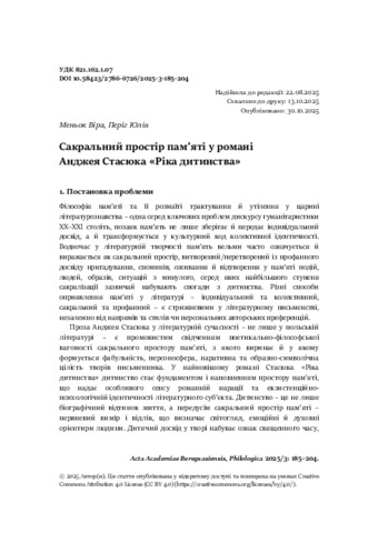 Авторки статті зосереджуються на сакральному та профанному, індивідуальному та колективному оприявленні топосу ріки як простору пам’яті у книзі Анджея Стасюка «Ріка дитинства», з урахуванням художніх утілень і переосмислень концептів малої батьківщини та дитинства. У розвідці проінтерпретовано фундаментальний у романі образ ріки Буг та його перетворення через спогади письменника з реально-профанного, природно-географічного об’єкта на сакральний символ межі, переходу, хаосу, часу, проминання, смерті. Особливу увагу акцентовано на амбівалентності символу ріки: в інтерпретованому романі ріка водночас приваблює й загрожує, пробуджує захоплення й страх, формує перші екзистенційні відчуття й досвіди, які стають основою творчих інтенцій і залишаються знаками важкої пам’яті, складного досвіду. Багатогранну символіку ріки проаналізовано з опертям на класичні концепції Хуана Едуарда Керлота, Манфреда Луркера, Єжи Бартмінського, Владислава Копалінського, в яких ріка трактується як універсальний символ плину життя, смерті й відродження, архетипна межа між світами та між різними людськими досвідами. Символ ріки містить енергію творення й знищення, є місцем любовних переживань та злочину й смерті, у сакральних трактуваннях уособлює пророцтво, книгу завіту й порятунок і водночас межу між гріхом та каяттям, між чистилищем та раєм. Гетерогенна символіка ріки втілюється у романі Стасюка як сакральна вісь світу (axis mundi), що поєднує індивідуальний досвід дитинства з універсальними законами буття. Символіка ріки в інтерпретованому романі – не лише топографія пам’яті, а й особлива «мова дитинства», завдяки якій вибудовується письменницький наратив повернення до джерел. Сакральний простір пам’яті у романі Стасюка оприявнюється у праматеринському концепті визнання гріхів і каяття: пам’ять є плином ріки, що несе порятунок від травматичних досвідів минулого, ріка є і збереженням пам’яті дитинства, і подоланням важких спогадів, змиванням гріхів у водах ріки дитинства. В інтерпретованому романі Стасюка ріка містить ключові прикмети універсального міфологічного та сакрально-біблійного образу, стисло пов’язаного з профанними народними віруваннями, у якому відлунює індивідуальна пам’ять письменника та колективні архетипні уявлення про відродження життя, проминання, смерть і вічність. Запропонований у розвідці підхід поєднує літературну інтерпретацію з культурологічно-антропологічним та архетипно- символічним вимірами, увиразнює значення малої батьківщини та сакральної топографії дитинства для сучасної польської літератури. У перспективі досліджень творчості Анджея Стасюка акцентуватиметься міждисциплінарна інтерпретація, яка охоплюватиме проблеми літературної антропології, культурної географії та геопоетики, філософії пам’яті та компаративних літературознавчих студій, що уможливить нові прочитання прози Стасюка та вивчення його письменницького феномену у контексті сучасної української літератури. | The authors of the article focus on the sacred and profane, individual and collective manifestations of the river topos as a space of memory in Andrzej Stasiuk’s book “River of Childhood”, considering the artistic representations and reinterpretations of the concepts of small homeland and childhood. The study interprets the fundamental image of the Bug River in the novel and its transformation through the writer’s memories from a real and profane, natural-geographical object into a sacred symbol of the border, transition, chaos, time, transience, and de