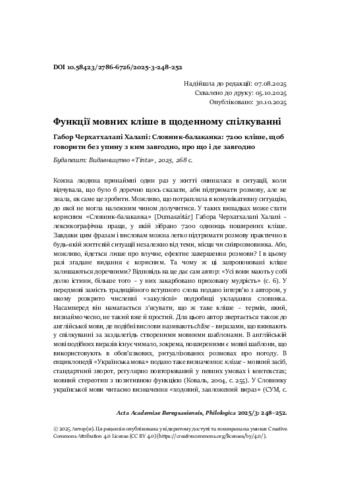Karmacsi, Zoltán and Bárány, Béla (2025) Функції мовних кліше в щоденному спілкуванні. ACTA ACADEMIAE BEREGSASIENSIS, PHILOLOGICA, 4 (3). pp. 248-252. ISSN 27866718