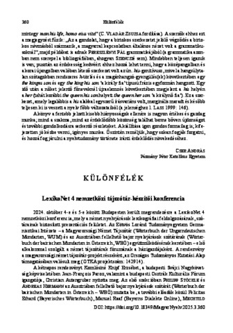 Nagy, Illés (2025) LexikoNet 4 nemzetközi tájszótár-készítői konferencia. MAGYAR NYELV, 121 (3). pp. 360-362. ISSN 0025-0228
