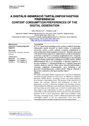Mikis, Martina and Tessényi, Judit (2024) A digitális generáció tartalomfogyasztási preferenciái = Content consumption preferences of the digital generation. GRADUS, 11 (2). ISSN 2064-8014