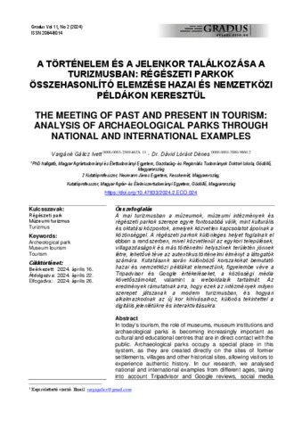 A mai turizmusban a múzeumok, múzeumi intézmények és régészeti parkok szerepe egyre fontosabbá válik, mint kulturális és oktatási központok, amelyek közvetlen kapcsolatot ápolnak a közönséggel. A régészeti parkok különleges helyet foglalnak el ebben a rendszerben, mivel közvetlenül az egykori települések, villagazdaságok és más történelmi helyszínek területén jönnek létre, lehetővé téve az autentikus történelmi élményt a látogatók számára. Kutatásunk során különböző korszakokat bemutató hazai és nemzetközi példákat elemeztünk, figyelembe véve a Tripadvisor és Google értékeléseket, a közösségi média követőszámokat, valamint a weboldalaik tartalmát. Az eredmények rámutatnak arra, hogy ezek az intézmények milyen szerepet játszanak a modern turizmusban, és hogyan alkalmazkodnak az új kor kihívásaihoz, különös tekintettel a digitális jelenlétükre és interaktivitásukra. In today's tourism, the role of museums, museum institutions and archaeological parks is becoming increasingly important as cultural and educational centres that are in direct contact with the public. Archaeological parks occupy a special place in this system, as they are created directly on the sites of former settlements, villages and other historical sites, allowing visitors to experience authentic history. In our research, we analysed national and international examples from different ages, taking into account Tripadvisor and Google reviews, social media followers, as well as the content of their websites. The results highlight the role of these institutions in modern tourism and how they are adapting to the challenges of the new era, in particular their digital presence and interactivity.