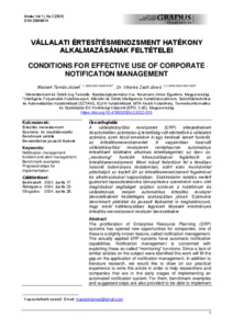 A vállalatirányítási rendszerek (ERP) elterjedésének köszönhetően számtalan új lehetőség vált elérhetővé a vállalatok számára, ezek közül emelnénk ki egy kevéssé ismert funkciót, az értesítésmenedzsmentet. A napjainkban használt vállalatirányítási rendszerek rendelkeznek automatikus értesítések küldésére alkalmas lehetőségekkel, az ilyen ún. „monitoring” funkciók kihasználásával foglalkozik az értesítésmenedzsment. Mivel hiányt fedeztünk fel a témában hasonló tudományos irodalomban, ezért ezen munkánkkal pótolhatjuk az észlelt űrt az értesítésmenedzsment fogalmával és alkalmazásával kapcsolatban. Szakirodalmi kutatás mellett gyakorlati tapasztalatainkra támaszkodva szeretnénk ezen cikk megírásával segítséget nyújtani azoknak a kutatóknak és vállalatoknak, melyek automatikus értesítés rendszer bevezetésének kezdetleges szakaszában járnak. Számukra benchmark példákat és javasolt lépéseket is meghatározunk, hogy minél hatékonyabban legyenek képesek eredményes értesítés menedzsment rendszer bevezetésére. | The proliferation of Enterprise Resource Planning (ERP) systems has opened new opportunities for companies, one of these is a slightly known feature, called notification management. The actually applied ERP systems have automatic notification capabilities. Notification management is concerned with exploiting these so-called "monitoring" functions. Since a lack of similar articles on the subject were identified this work will fill the gap on the application of notification management. In addition to literature research, we would like to draw on our practical experience to write this article in order to help researchers and companies that are in the early stages of implementing an automated notification system. For them, benchmark examples and suggested steps are also provided to be able to implement an effective notification management system as efficiently as possible.