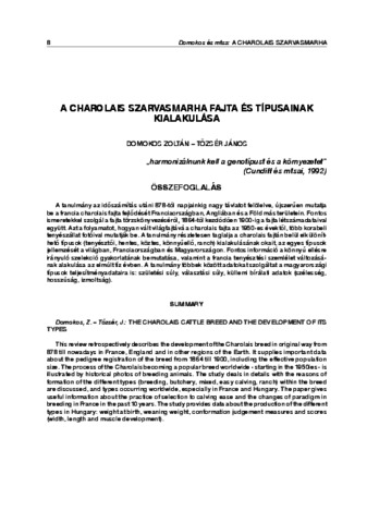 Domokos, Zoltán and Tőzsér, János (2015) A charolais szarvasmarha fajta és típusainak kialakulása. ÁLLATTENYÉSZTÉS ÉS TAKARMÁNYOZÁS, 64 (1). pp. 8-20. ISSN 0230-1814