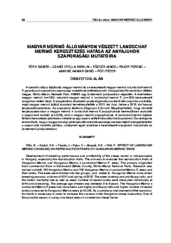 Tóth, Gábor and Szabó Stella, Katalin and Tőzsér, János and Pajor, Ferenc and Abayné Hamar, Enikő and Póti, Péter (2015) Magyar merinó állományon végzett landschaf merinó keresztezés hatása az anyajuhok szaporasági mutatóira. ÁLLATTENYÉSZTÉS ÉS TAKARMÁNYOZÁS, 64 (2). pp. 94-100. ISSN 0230-1814