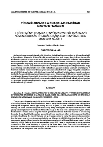 Domokos, Zoltán and Tőzsér, János (2015) Típusváltozások a charolais fajtában magyarországon 1. Közlemény: francia tenyészanyagból származó növendékbikák típusváltozása egy tenyészetben 2006-2014 között. ÁLLATTENYÉSZTÉS ÉS TAKARMÁNYOZÁS, 64 (3). pp. 151-163. ISSN 0230-1814