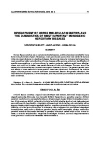 Sziszkosz, Nikolett and Jávor, András and Kusza, Szilvia (2016) Evelopment of horse molecular genetics and the diagnostics of most important monogenic hereditary diseases. ÁLLATTENYÉSZTÉS ÉS TAKARMÁNYOZÁS, 65 (3). pp. 71-81. ISSN 0230-1814