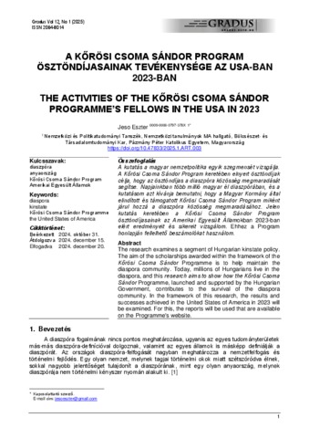 A kutatás a magyar nemzetpolitika egyik szegmensét vizsgálja. A Kőrösi Csoma Sándor Program keretében elnyert ösztöndíjak célja, hogy az ösztöndíjas a diaszpóra közösség megmaradását segítse. Napjainkban több millió magyar él diaszpórában, és a kutatásom azt kívánja bemutatni, hogy a Magyar Kormány által elindított és támogatott Kőrösi Csoma Sándor Program miként járul hozzá a diaszpóra közösség megmaradásához. Jelen kutatás keretében a Kőrösi Csoma Sándor Program ösztöndíjasainak az Amerikai Egyesült Államokban 2023-ban elért eredményeit és sikereit vizsgálom. Ehhez a Program honlapján fellelhető beszámolókat használom. The research examines a segment of Hungarian kinstate policy. The aim of the scholarships awarded within the framework of the Kőrösi Csoma Sándor Programme is to help maintain the diaspora community. Today, millions of Hungarians live in the diaspora, and this research aims to show how the Kőrösi Csoma Sándor Programme, launched and supported by the Hungarian Government, contributes to the survival of the diaspora community. In the framework of this research, the results and successes achieved in the United States of America in 2023 will be examined. For this, the reports will be used that are available on the Programme's website.