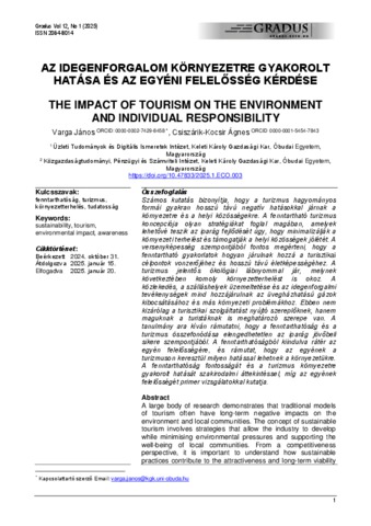 Számos kutatás bizonyítja, hogy a turizmus hagyományos formái gyakran hosszú távú negatív hatásokkal járnak a környezetre és a helyi közösségekre. A fenntartható turizmus koncepciója olyan stratégiákat foglal magában, amelyek lehetővé teszik az iparág fejlődését úgy, hogy minimalizálják a környezeti terhelést és támogatják a helyi közösségek jólétét. A versenyképesség szempontjából fontos megérteni, hogy a fenntartható gyakorlatok hogyan járulnak hozzá a turisztikai célpontok vonzerőjéhez és hosszú távú életképességéhez. A turizmus jelentős ökológiai lábnyommal jár, melynek következtében komoly környezetterhelést is okoz. A közlekedés, a szálláshelyek üzemeltetése és az idegenforgalmi tevékenységek mind hozzájárulnak az üvegházhatású gázok kibocsátásához és más környezeti problémákhoz. Ebben nem kizárólag a turisztikai szolgáltatást nyújtó szereplőknek, hanem maguknak a turistáknak is meghatározó szerepe van. A tanulmány ara kíván rámutatni, hogy a fenntarthatóság és a turizmus összefonódása elengedhetetlen az iparág jövőbeli sikere szempontjából. A fenntarthatóságból kiindulva rátér az egyén felelősségére, és rámutat, hogy az egyének a turizmuson keresztül milyen hatással lehetnek a környezetükre. A fenntarthatóság fontosságát és a turizmus környezetre gyakorolt hatását szakirodalmi áttekintéssel, míg az egyének felelősségét primer vizsgálatokkal kutatja. A large body of research demonstrates that traditional models of tourism often have long-term negative impacts on the environment and local communities. The concept of sustainable tourism involves strategies that allow the industry to develop while minimising environmental pressures and supporting the well-being of local communities. From a competitiveness perspective, it is important to understand how sustainable practices contribute to the attractiveness and long-term viability of tourism destinations. Tourism has a significant ecological footprint, with consequent impacts on the environment. Transport, accommodation operations and tourism activities all contribute to greenhouse gas emissions and other environmental problems. Not only tourism service providers but also tourists themselves play a key role in this. Overall, the study shows that the interlinking of sustainability and tourism is essential for the future success of the industry. It takes sustainability as a starting point and looks at the responsibility of individuals and the impact they can have on their environment through tourism. It explores the importance of sustainability and the impact of tourism on the environment through a literature review, while the responsibility of individuals is explored through primary research.