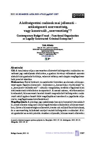 Cél: A tanulmány célja a szervezetten elkövetett költségvetési csalásokra vonatkozó jogi szabályozás áttekintése, a gyakori törvényi változások nyomán alakuló bírói gyakorlat kritikája, valamint néhány, ezek alapján megfogalmazható javaslat vázolása.Módszertan: Rövid történeti visszatekintést követően az elemzés a bűnszervezet egyes fogalmi elemeinek – különösen a „hierarchikus struktúrának” és a „konspiratív működésnek” – aktuális vizsgálatára, továbbá e fogalmak bírói értelmezésének értékelésére összpontosít. A szerző számos, véletlenszerűen kiválasztott, bűnszervezeti keretek között megvalósított költségvetési csalás miatt indult ügyben hozott ítélet megállapításait szembesíti a jogalkotás céljaival és megfogalmazza következtetéseit.Megállapítások: A jelenlegi jogi szabályozás hosszú és bonyolult úton alakult ki; ennek ellenére máig nem sikerült egyértelműen elkülöníteni a bűnszervezetben, illetve a bűnszövetségben elkövetett, évente sok milliárd forint kárt okozó, de a szervezettség különböző szintjeit mutató költségvetési csalásokat. A bírói gyakorlat az esetek jelentős részében súlyosabb, bűnszervezeti elkövetési formaként kezeli az ügyeket, még akkor is, ha elméleti és gyakorlati szempontból elegendő lenne a szervezettség enyhébb fokának megállapítása. A tanulmányban megfogalmazott ajánlások megfontolása a vádlottak együttműködési készségének növelését, a bűnös úton szerzett vagyon nagyobb arányú visszaszerzését és eredményesebb jóvátételt eredményezhetne.Érték: A tanulmány felvetései és javaslatai hozzájárulhatnak az ítélkezési gyakorlat egységességéhez, valamint a jogbiztonság, az arányosság és a szubszidiaritás büntetőjogi elveinek erősítéséhez. A represszív szankciók és a helyreállító intézkedések megfelelő arányának kialakítása elősegítheti a költségvetés hatékonyabb védelmét. | Aim: This study aims to review the legal framework regulating organized budgetary fraud, critique the evolving judicial practice shaped by frequent legislative changes, and outline several recommendations based on these observations. Methodology: Following a brief historical overview, the analysis examines key conceptual elements of criminal organizations — specifically “hierarchical structure” and “conspiratorial operation” — and evaluates their interpretation in judicial practice. The author compares findings from twenty randomly selected court decisions concerning budgetary fraud prosecuted under organized crime legislation with the aims and requirements of the legislation, and draws conclusions accordingly. Findings: The current legal framework has evolved through a long and winding path; however, it still fails to clearly differentiate between budgetary fraud committed as part of a criminal organization and that committed through criminal conspiracy, despite both causing multi-billion-forint damages to the national budget annually. Judicial practice tends to classify many such cases as involving organized crime, even when, from both theoretical and practical perspectives, attributing a less severe form of organized involvement would be more appropriate. The recommendations at the end of the study suggest that enhancing defendants’ willingness to cooperate could lead to more effective recovery of illicit assets and better support for reparative claims. Value: The proposals raised in this study may contribute to greater consistency in judicial decision-making, reinforcing the principles of legal certainty, proportionality, and subsidiarity in criminal law. Proper balancing of repressive sanctions and restorative measures could also enhance the protection of the national budget.