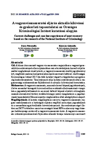 Cél: A bűnös úton szerzett vagyon visszaszerzése napjainkban a vagyont generáló bűncselekmények elleni eljárásokban már a büntetőeljárás kiemelt célját és ezáltal meghatározó részét jelenti; a vagyonvisszaszerzés önálló jogintézmény lett, megfelelő szakmai kompetenciákra épülő szervezeti háttérrel. Az Országos Kriminológiai Intézet 2017 óta több kutatást végzett a tárgykörben az ügyészség kezdeményezésére. Tanulmányunk célja kutatási eredményeink által a magyarországi eszközrendszer fejlődésének és aktuális kihívásainak bemutatása.Módszertan: A vagyonvisszaszerzés, az annak elemeit képező jogintézmények, illetve az azokat támogató kriminalisztikai eszközök alkalmazásának vizsgálata a jogszabályváltozások és az ennek hátterét képező elméleti célmeghatározások elemzésével történt, továbbá bűnügyi iratok vizsgálatán és a jogalkalmazói tapasztalatok fókuszcsoportos megbeszélése általi adatgyűjtésen alapult.Megállapítások: A kutatás megállapításai szerint a vagyonvisszaszerzés magyar szabályozása és a hatóságok eljárása megfelel az európai jogszabályok és a nemzetközi együttműködés követelményeinek. Az eredményességet illetően az FATF értékelése szerint az országok közel 80%-a alacsony vagy közepes hatékonysági szinten áll a vagyonvisszaszerzés terén. A vagyonvisszaszerzés intézményrendszerének fejlesztése állandó témája valamennyi szervezett bűnözéssel, pénzügyi nyomozással foglalkozó nemzetközi szervezetnek, emellett világszerte számos kutatás foglalkozik a hatékonyság növelése tényezőinek, alkalmazott eszközeinek és kívánalmainak elemzésével. A tapasztalatok szerint további erőfeszítésekre és folyamatos elemzésekre egyaránt szükség van.Érték: Az OKRI-ban folytatott kutatások a célirányos szabályozás bevezetésének kezdetétől szakaszosan végigkísérték a jogintézmény fejlődését, általuk – a joggyakorlat tapasztalataival együtt – egészen napjainkig nyomon követhetőek a lényegesebb állomások, változások. A tanulmány az alapját képező vizsgálatok nyomán felhívja a figyelmet az aktuális nemzetközi kihívásokra és a legújabb intézkedésekre, amelyek a hazai vagyonvisszaszerzés eredményességéhez is hozzájárulhatnak. | Aim: The recovery of assets acquired through criminal means has, in contemporary criminal proceedings against profit-generating offences, become a principal objective – and thus a defining element of – criminal procedure. Asset recovery has evolved into an autonomous legal institution, supported by specialized organizational structures and professional expertise. Since 2017, the National Institute of Criminology has conducted several research projects on the subject at the initiative of the prosecutor’s office. The aim of our study is to present the development and current challenges of the Hungarian asset recovery framework through our research results. Methodology: The examination of asset recovery, the constituent legal institutions thereof, and the supporting forensic tools was carried out through an analysis of legislative developments and the underlying theoretical objectives that informed such changes. In addition, the study was grounded in the review of criminal case files and the collection of empirical data via focus group discussions with practitioners. Findings: According to the findings of the research, the Hungarian legal framework for asset recovery, as well as the procedures followed by the authorities, are in compliance with the requirements of European legal instruments and international cooperation. In terms of effectiveness, assessments of the FATF Global Network found that almost 80% of countries – more than 200 – are at low or moderate level of effectiveness on asset recovery. The development of (institutional) frameworks for asset recovery remains a constant subject of focus for all international organizations concerned with organised crime and financial investigations. Moreover, numerous studies worldwide examine the factors, instruments, and standards that may enhance effectiveness in this domain. Experience demonstrates that both further efforts and ongoing analyses are necessary. Value: The research conducted at the National Institute of Criminology (OKRI) has, from the introduction of targeted regulation, continuously followed the evolution of this legal institution. Through these studies, the key milestones can be traced up to the present day, while they also highlight the current international challenges which may contribute to the effectiveness of asset recovery efforts in Hungary.