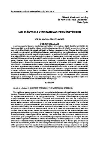 Kozák, János and Szász, Sándor (2016) Mai irányok a víziszárnyas-tenyésztésben. ÁLLATTENYÉSZTÉS ÉS TAKARMÁNYOZÁS, 65 (4). pp. 47-73. ISSN 0230-1814