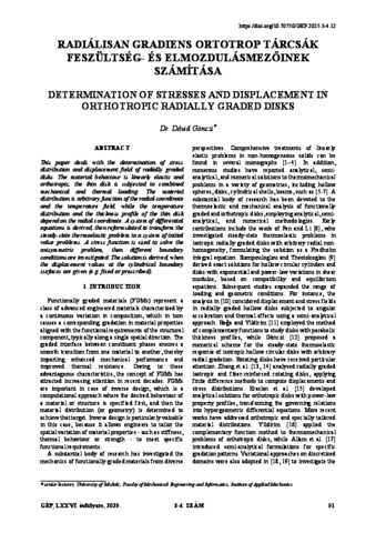 Gönczi, Dávid (2025) Determination of stresses and displacement in orthotropic radially graded disks. GÉP, 76 (3-4). pp. 51-54. ISSN 0016-8572