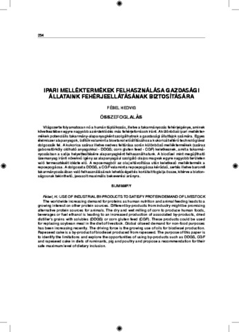 Világszerte folyamatosan nő a humán táplálkozás, illetve a takarmányozás fehérjeigénye, aminek következtében egyre nagyobb az érdeklődés más fehérjeforrások iránt. A különböző ipari melléktermékek potenciális takarmány-alapanyagként szolgálhatnak a gazdasági állatfajok számára. Egyes élelmiszer alapanyagok, üdítők valamint a bioetanol előállításához a kukoricát eltérő technológiával dolgozzák fel. A kukorica száraz illetve nedves feltárása során különböző melléktermékek (száraz gabonatörköly oldható anyagokkal - DDGS; corn gluten feed - CGF) keletkeznek, amit a takarmányozásban a szója helyettesítésére alapanyagként felhasználhatunk. A biodízel mint megújítható üzemanyag iránti növekvő igény az alapanyagául szolgáló olajos magvak egyre nagyobb területen való termesztését idézte elő. A repcemagból az olaj eltávolítása után keletkező melléktermék a repcepogácsa. A dolgozat a DDGS, a CGF valamint a repcepogácsa kérődző, sertés illetve baromfi takarmányozásában való felhasználásának lehetőségeit és korlátait foglalja össze, kitérve a biztonságosnak tekinthető, javasolt maximális bekeverési arányra.