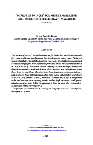 Pulay, Gyula Zoltán (2025) “Mirror of Princes” for Middle Managers: Role Models for Subordinate Managers. In: Ethical Leadership in Complex Times. Károli könyvek. Tanulmánykötet . Éditions L'Harmattan; L'Harmattan Kiadó; Károli Gáspár Református Egyetem, Paris, Budapest, pp. 145-160. ISBN 9782336540870; 9789636464202