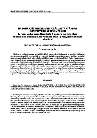 Markovits, Rozina and Novotniné Dankó, Gabriella (2019) Babonák és hiedelmek az állattartásban füzesgyarmat környékén 2. rész: jeles napokhoz kötött babonák, állatokhoz kapcsolódó szólások, mondások, falusi gyógyítók babonás eljárásai. ÁLLATTENYÉSZTÉS ÉS TAKARMÁNYOZÁS, 68 (1). pp. 51-61. ISSN 0230-1814