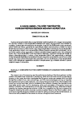 Bardóczky, Veronika (2019) A hazai angol telivér tenyésztés versenyképességének néhány aspektusa. ÁLLATTENYÉSZTÉS ÉS TAKARMÁNYOZÁS, 68 (2). pp. 137-149. ISSN 0230-1814