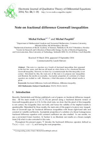 Feckan, Michal and Pospíšil, Michal (2014) Note on fractional difference Gronwall inequalities. Electronic Journal of Qualitative Theory of Differential Equations, 2014 (44). pp. 1-18. ISSN 1417-3875