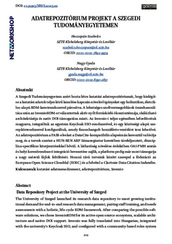 A Szegedi Tudományegyetem azért hozta létre kutatási adatrepozitóriumát, hogy kielégítse a kutatási adatok teljes körű kezelése kapcsán növekvő igényeket egy holisztikus, életciklus-alapú RDM-keretrendszerrel párosítva. A lehetséges szoftvermegoldások összehasonlítása után az InvenioRDM-et választottuk aktív nyílt forráskódú ökoszisztémája, skálázható architektúrája és natív DOI-támogatása miatt. Az Invenio-t teljes egészében lefordítottuk magyarra, integráltuk az egyetem Keycloak SSO-rendszerével, és egy közösségi alapú szerepkörrendszerrel konfiguráltuk, amely finomhangolt hozzáférés-vezérlést tesz lehetővé. Az adatrepozitórium a FAIR-elveket a DataCite-kompatibilis alapsémán keresztül valósítja meg, és a tervek szerint a HUN-REN ARP Sémaregiszter keretében társfeljesztett, diszciplína-specifikus kiterjesztésekkel bővül. A láthatóság növelése érdekében OAI-PMH aratás és helyi keresőrendszeri integráció bevezetése zajlik, a platform pedig már most támogatja a nagy méretű fájlok feltöltését. Hosszú távú terveink között szerepel a föderáció az European Open Science Clouddal (EOSC) és a felvétel a Clarivate Data Citation Indexébe. | The University of Szeged launched its research data repository to meet growing institutional demand for end-to-end research data management, pairing staff training, and needs assessments with a holistic, life-cycle RDM framework. After comparing the possible software solutions, we chose InvenioRDM for its active open source ecosystem, scalable architecture and native DOI support. Invenio was fully translated into Hungarian, integrated with the university’s Keycloak SSO, and configured with a community-based roles system that enables fine-grained access control. The data repository implements FAIR principles through the DataCite-compliant core schema and according to the plans with some discipline-specific extensions co-developed through the HUN-REN ARP Schema Registry. OAIPMH harvesting and local discovery integration are being added to broaden visibility, and the platform already supports large file uploads. Long-term plans target federation with the European Open Science Cloud and inclusion in Clarivate’s Data Citation Index.