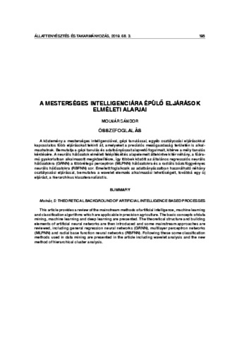 A közlemény a mesterséges intelligenciával, gépi tanulással, egyéb osztályozási eljárásokkal kapcsolatos főbb eljárásokat tekinti át, amelyeket a precíziós mezőgazdaság területén is alkalmazhatnak. Bemutatja a gépi tanulás és adatbányászat alapvető fogalmait, kitérve a mély tanulás kérdésére. A neurális hálózatok elméleti felépítését és alapelemeit áttekintve kitér néhány, a főáramú gyakorlatban alkalmazott megközelítésre, így többek között az általános regressziós neurális hálózatokra (GRNN) a többrétegű perceptron (MLPNN) hálózatokra és a radiális bázisfüggvényes neurális hálózatokra (RBFNN) sor. Emellett foglalkozik az adatbányászatban használható néhány osztályozási eljárással, bemutatva a wavelet elemzés alkalmazási lehetőségeit, továbbá egy új eljárást, a hierarchikus klaszteranalízist is.