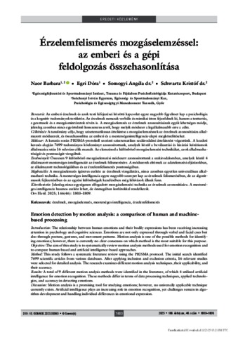 Bevezetés: Az emberi érzelmek és azok testi kifejezései közötti kapcsolat egyre nagyobb figyelmet kap a pszichológia és a kognitív tudományok területén. Az érzelmek nemcsak verbális és mimikai úton fejeződnek ki, hanem a testtartás, a gesztusok és a mozgásmintázatok révén is. A mozgáselemzés az érzelmek azonosításának egyik lehetséges módja, jelenleg azonban nincs egyértelmű konszenzus arról, hogy melyik módszer a legalkalmasabb erre a célra. Célkitűzés: A tanulmány célja, hogy szisztematikusan áttekintse a mozgáselemzésnek az érzelmek azonosítására alkal- mazott módszereit, és összehasonlítsa az emberi és a mesterségesintelligencia-alapú megközelítéseket. Módszer: A kutatás során PRISMA-protokoll szerinti szisztematikus szakirodalmi áttekintést végeztünk. A kezdeti keresés alapján 7699 tudományos közleményt azonosítottunk, amelyek közül a beválasztási és kizárási kritériumok alkalmazása után 16 releváns cikk maradt. Az elemzéssel a különböző mozgáselemzési technikákat, azok alkalmazha- tóságát és pontosságát vizsgáltuk. Eredmények: Összesen 9 különböző mozgáselemzési módszert azonosítottunk a szakirodalomban, amelyek közül 4 alkalmazott mesterséges intelligenciát az érzelmek felismerésére. A módszerek eltérnek az adatelemzési eljárásokban, az alkalmazott technológiákban és az érzelemfelismerés pontosságában. Megbeszélés: A mozgáselemzés ígéretes eszköz az érzelmek vizsgálatára, nincs azonban egyetlen univerzálisan alkal- mazható technika. A mesterséges intelligencia egyre nagyobb szerepet kap az érzelmek felismerésében, de az algorit- musok fejlesztésében és az egyéni különbségek kezelésében még kihívások állnak fenn. Következtetés: Jelenleg nincs egységesen elfogadott mozgáselemzési technika az érzelmek azonosítására. A mestersé- ges intelligencia hasznos eszköz lehet, de önmagában korlátokkal rendelkezik. Orv Hetil. 2025; 166(46): 1803–1809. | Introduction: The relationship between human emotions and their bodily expressions has been receiving increasing attention in psychology and cognitive sciences. Emotions are not only expressed through verbal and facial cues but also through posture, gestures, and movement patterns. Motion analysis is one of the possible methods for identify- ing emotions; however, there is currently no clear consensus on which method is the most suitable for this purpose. Objective: The aim of this study is to systematically review motion analysis methods used for emotion recognition and to compare human-based and artificial intelligence-based approaches. Method: This study follows a systematic literature review using the PRISMA protocol. The initial search identified 7699 scientific articles from various databases. After applying inclusion and exclusion criteria, 16 relevant studies were selected for detailed analysis. The research examines different motion analysis techniques, their applicability, and their accuracy. Results: A total of 9 different motion analysis methods were identified in the literature, of which 4 utilized artificial intelligence for emotion recognition. These methods differ in terms of data processing techniques, applied technolo- gies, and accuracy in detecting emotions. Discussion: Motion analysis is a promising tool for studying emotions; however, no universally applicable technique currently exists. Artificial intelligence plays an increasing role in emotion recognition, yet challenges remain in algo- rithm development and handling individual differences in emotional expression. Conclusion: Currently, there is no single, universally accepted motion analysis technique for emotion identification. Artificial intelligence can be a useful tool, but it has limitations when used alone. The most reliable approach appears to be the application of multidisciplinary methods, which combine human observation, classical motion analysis, and machine learning techniques.