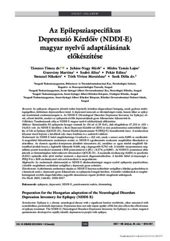 Tánczos, Tímea and Juhász-Nagy, Márk and Misku, Tamás Lajos and Guzsvány, Martina and Szabó, Alisa and Pekár, Edina and Stenczel, Nikolett and Tóth, Vivien Mercédesz and Szok, Délia (2025) Az Epilepsziaspecifikus Depresszió Kérdőív (NDDI-E) magyar nyelvű adaptálásának előkészítése = Preparation for the Hungarian adaptation of the Neurological Disorders Depression Inventory for Epilepsy (NDDI-E). ORVOSI HETILAP, 166 (46). pp. 1810-1817. ISSN 0030-6002