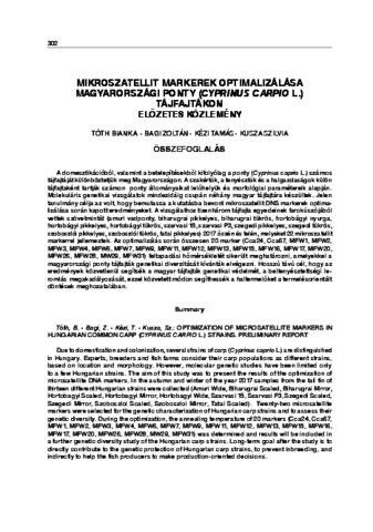 A domesztikációból, valamint a betelepítésekből kifolyólag a ponty (Cyprinus caprio L.) számos tájfajtáját különböztetjük meg Magyarországon. A szakértők, a tenyésztők és a halgazdaságok külön tájfajtaként tartják számon ponty állományaikat lelőhelyük és morfológiai paramétereik alapján. Molekuláris genetikai vizsgálatok mindezidáig csupán néhány magyar tájfajtára készültek. Jelen tanulmány célja az volt, hogy bemutassa a kutatásba bevont mikroszatellit DNS markerek optimalizálása során kapott eredményeket. A vizsgálathoz tizenhárom tájfajta egyedeinek farokúszójából vettek szövetmintát (amuri vadponty, biharugrai pikkelyes, biharugrai tükrös, hortobágyi nyurga, hortobágyi pikkelyes, hortobágyi tükrös, szarvasi 15, szarvasi P3, szegedi pikkelyes, szegedi tükrös, szoboszlói pikkelyes, szoboszlói tükrös, tatai pikkelyes) 2017 őszén és telén, melyeket 22 mikroszatellit markerrel jellemeztek. Az optimalizálás során összesen 20 marker (Cca24, Cca67, MFW1, MFW2, MFW3, MFW4, MFW6, MFW7, MFW9, MFW11, MFW12, MFW13, MFW15, MFW16, MFW17, MFW20, MFW26, MFW28, MW29, MFW31) feltapadási hőmérsékletét sikerült meghatározni, amelyekkel a magyarországi ponty tájfajták genetikai diverzitását kívánták elvégezni. Hosszú távú cél, hogy az eredmények közvetlenül segítsék a magyar tájfajták genetikai védelmét, a beltenyésztettségi leromlás megakadályozását, ezzel közvetett módon segíthessék a haltermelőket a termelésorientált döntések meghozatalában.