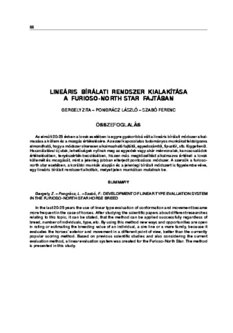 Az elmúlt 20-25 évben a lovak esetében is egyre gyakoribbá vált a lineáris bírálati módszer alkalmazása a küllem és a mozgás értékelésére. Az ezzel kapcsolatos tudományos munkákat feldolgozva elmondható, hogy a módszer sikeresen alkalmazható fajtától, egyedszámtól, típustól, stb. függetlenül. Használatával új utak, lehetőségek nyílnak meg az egyedek vagy akár ménvonalak, kancacsaládok értékelésében, tenyészérték-becslésében, hiszen más megközelítést alkalmazva értékeli a lovak küllemét és mozgását, mint a jelenleg jobban elterjedt pontozásos módszer. A szerzők a furiosonorth star esetében, a korábbi munkák alapján és a jelenlegi bírálati módszert is figyelembe véve, egy lineáris bírálati rendszert alkottak, melyet jelen munkában mutatnak be.
