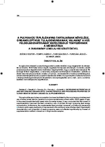 Zsédely, Eszter and Tempfli, Károly and Turcsány, Zsolt and Turcsány, László and Schmidt, János (2020) A pulykahús táplálóanyag-tartalmának növelése, organoleptikus tulajdonságainak, valamint a hús feldolgozhatóságát befolyásoló tényezőknek a módosítása a takarmány lenolaj-kiegészítésével. ÁLLATTENYÉSZTÉS ÉS TAKARMÁNYOZÁS, 69 (2). pp. 124-141. ISSN 0230-1814